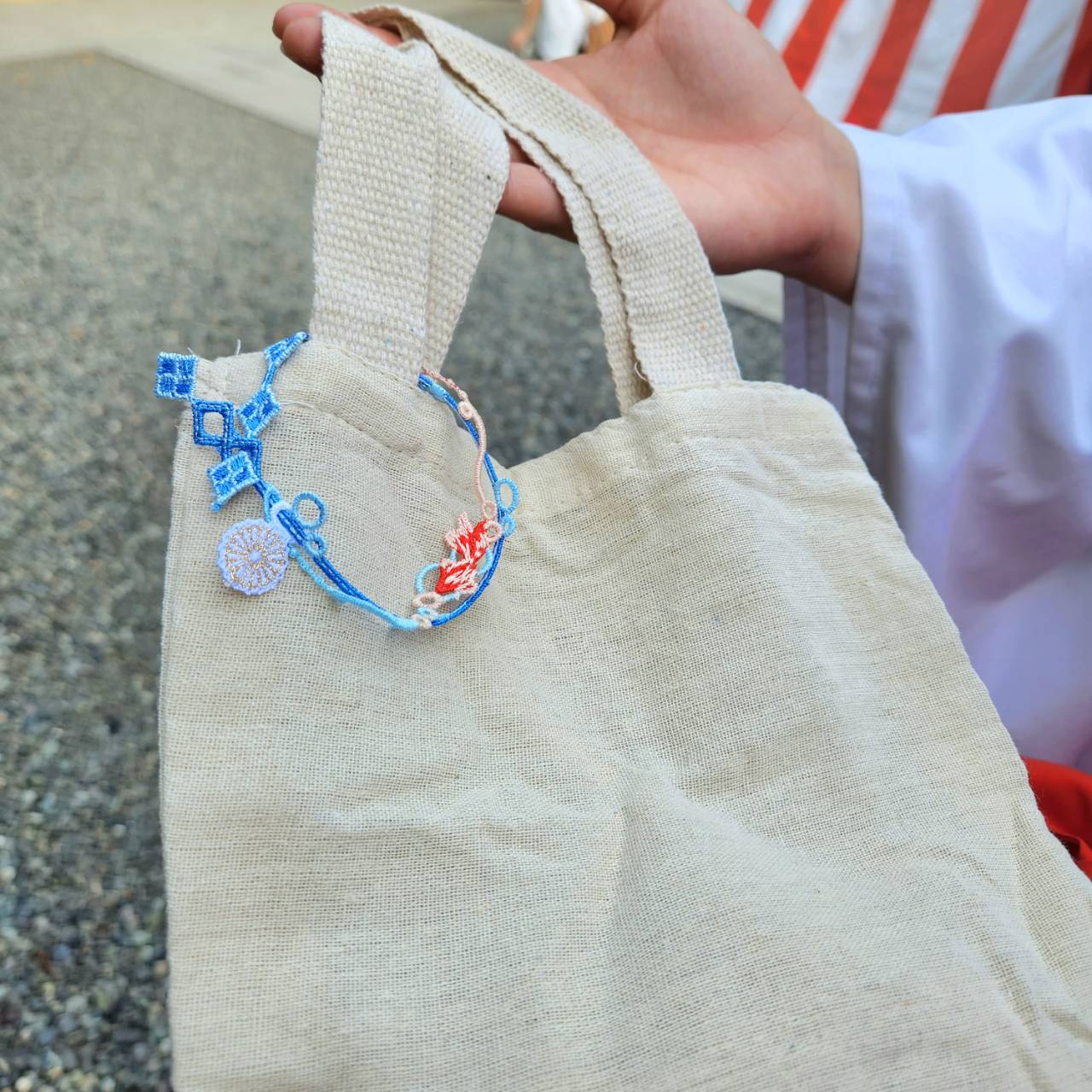 上記の写真のように神むすびの先端に穴が開いているのでそこにひもを通していただければブレスレッド状になります。ただ、ひし形◇の部分を一つ通しただけでは落ちやすくなってしまいますので何個か穴に通していただければ落ちる可能性は低くなると思います。
