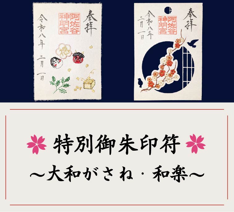 昨年より引き続き頒布の神むすび雅「花吹雪」「晴れ桜」に加え、本年は新たに「花明り」を頒布します。初穂料は各1800円です。