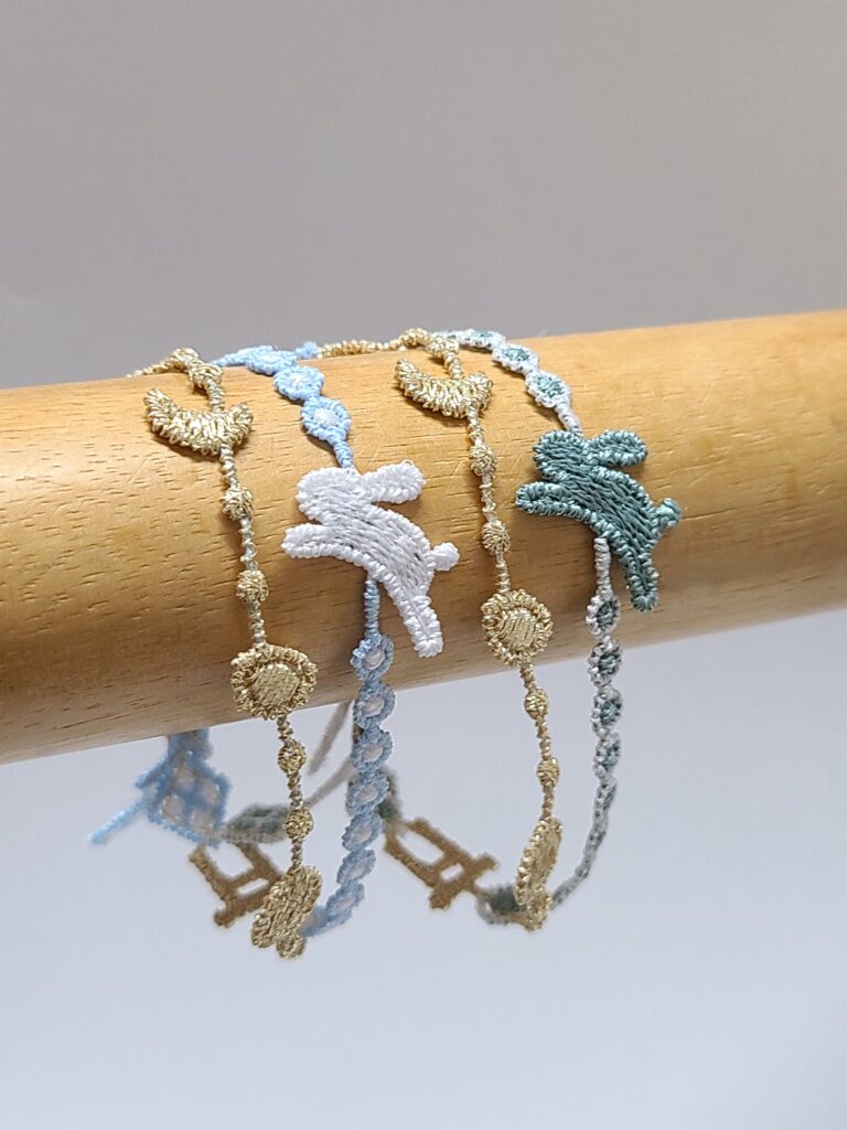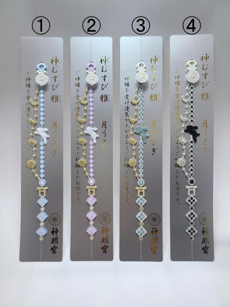 今年よりデザインを一新した、月の満ち欠けとうさぎをあしらったブレスレット型のお守りです。初穂料は各2000円です。(写真①~④)