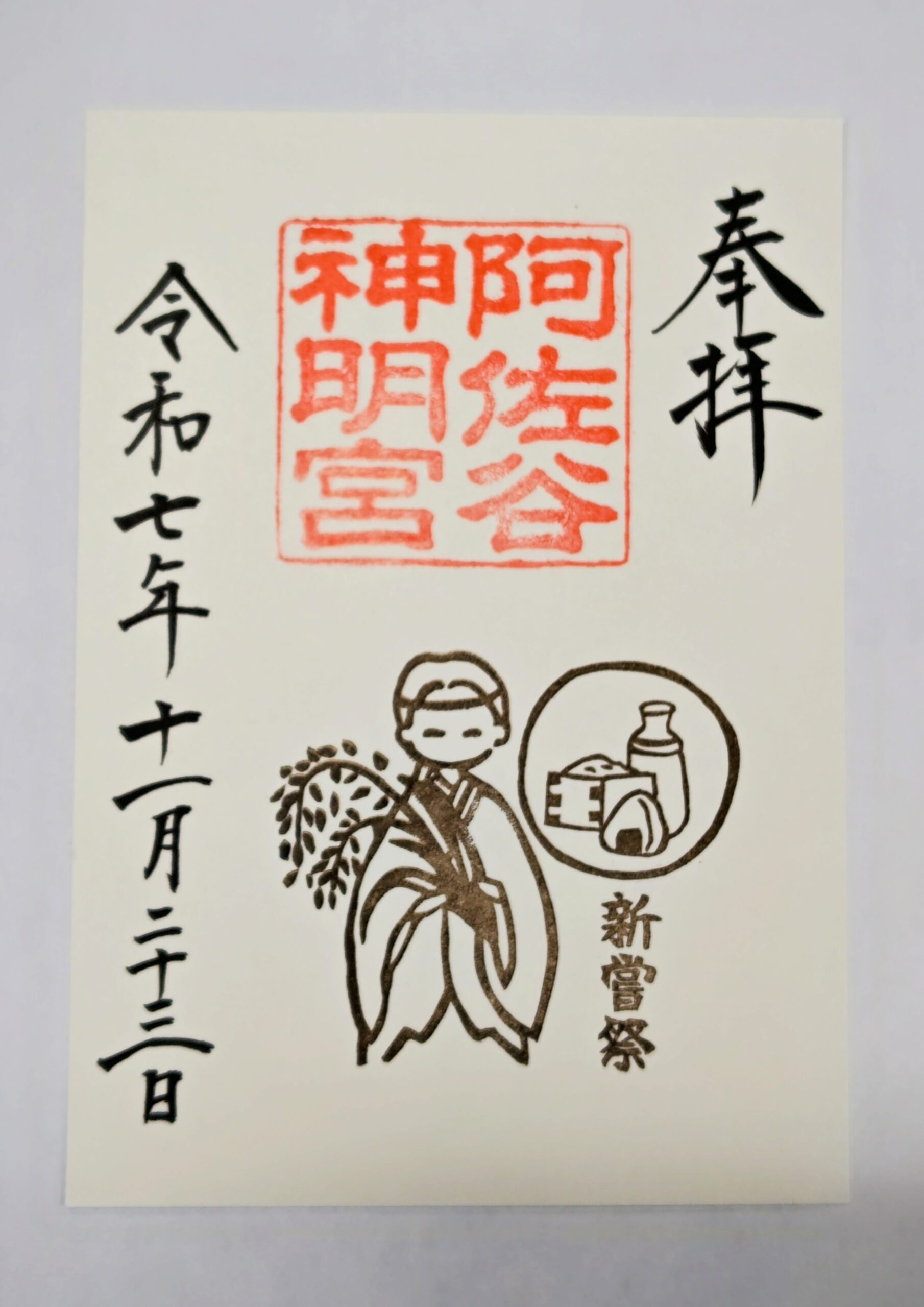 令和7年11月23日新嘗祭御朱印頒布のお知らせ 令和7年11月23日(日)、収穫された新穀を神様に供えて感謝の奉告をする新嘗祭が全国の神社で行われます。当日、御朱印をお受けの方に作物が実った様子をあしらった御朱印を頒布致します。